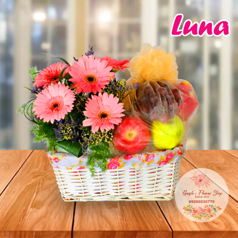 A bright and cheerful basket of Pink Gerberas including Grapes,Oranges,Apples and Pears. Perfect for any occasion as a general gift and for all ages!